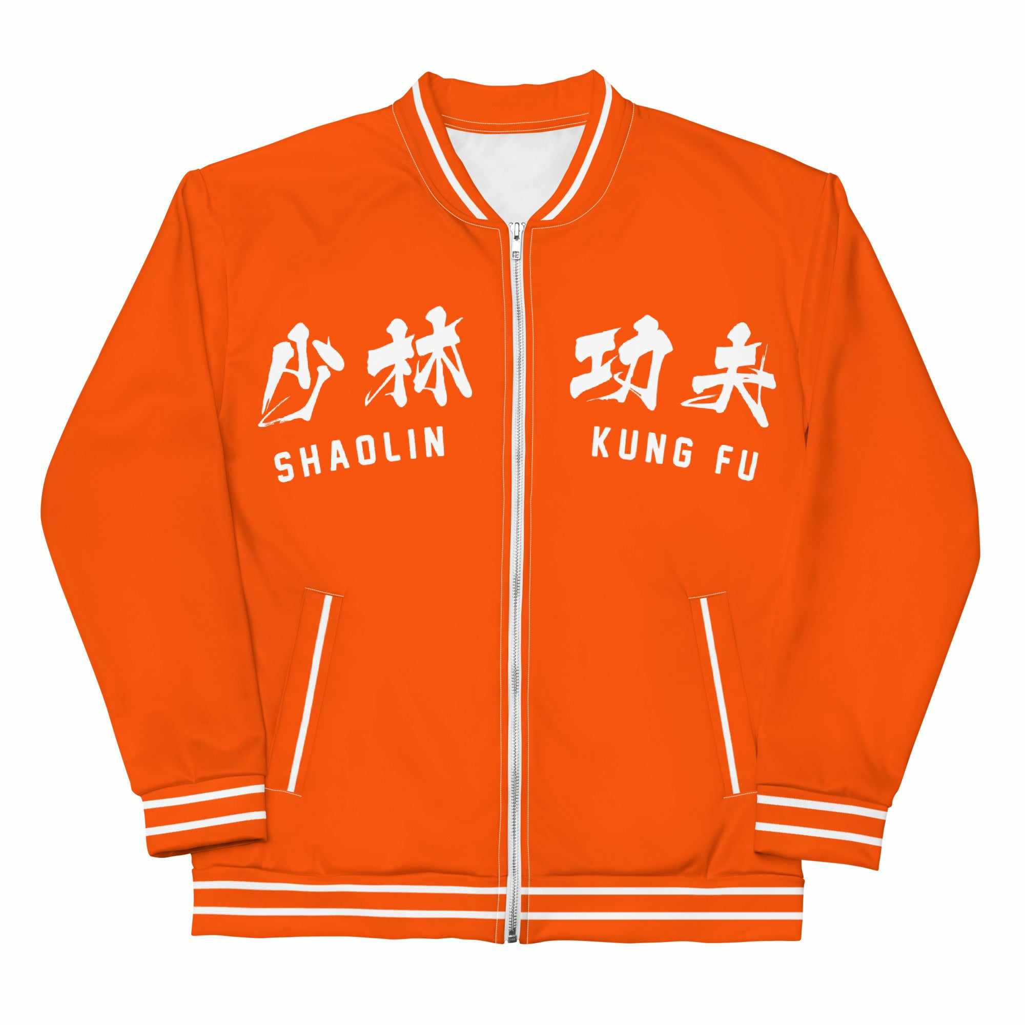 少林功夫 Shaolin Kung Fu Bomber Jacket, in iconic Shaolin Monk robe orange.